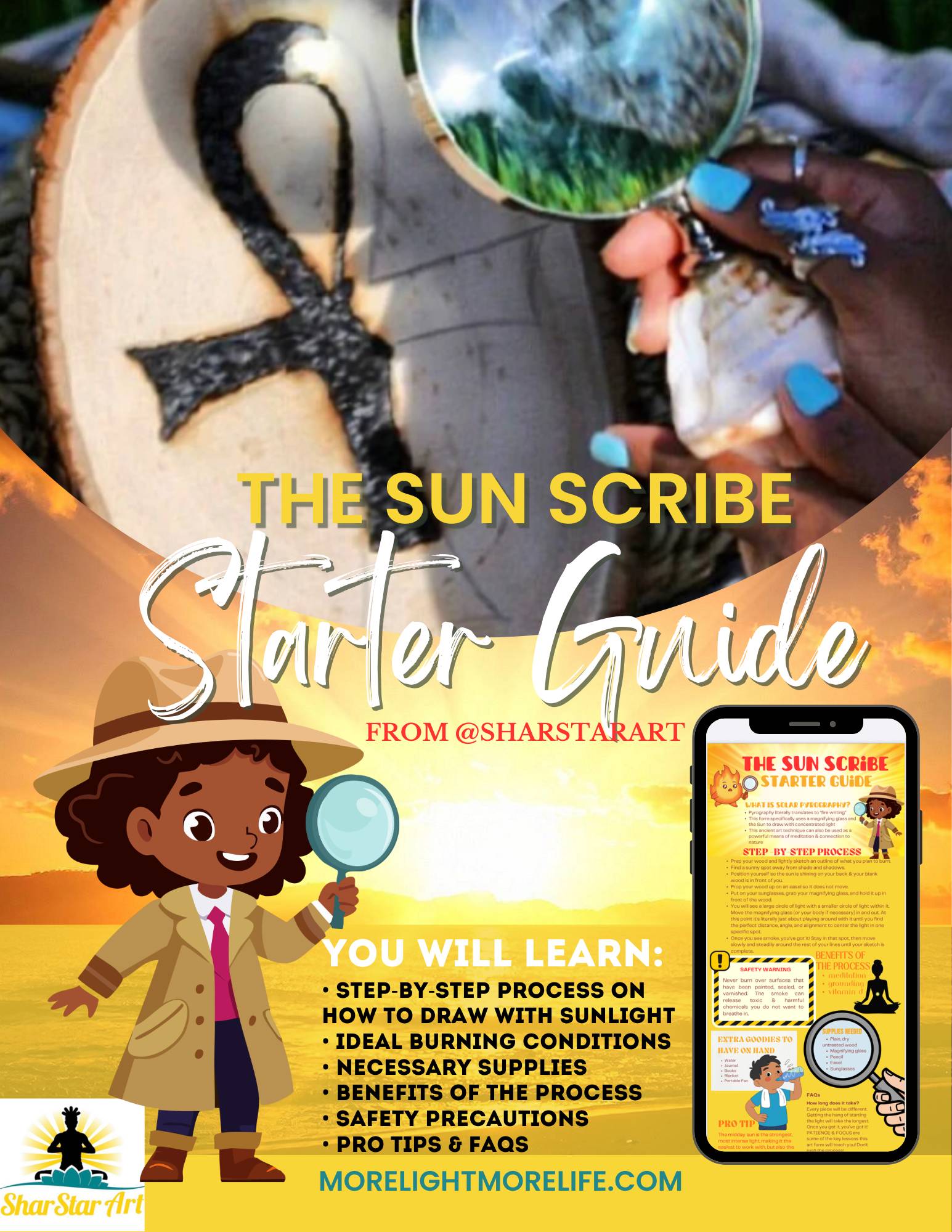 This guide is a comprehensive overview of the ancient art of solar pyrography—wood burning with sunlight. What seems complex is actually a rather simple process anyone can master with a little time, focus, and patience. The Sun Scribe Starter Guide will provide a brief look into the core principles and essential foundations you'll need to ignite your solar art journey! You Will Learn: * Definition of solar pyrography * Step-by -step process on how to draw with sunlight * Essential materials needed * Extra goodies to have * Ideal wood burning conditions * Safety precautions * Pro Tips * FAQs Get instant access when you subscribe to my monthly newsletter Sun Scribe Times.